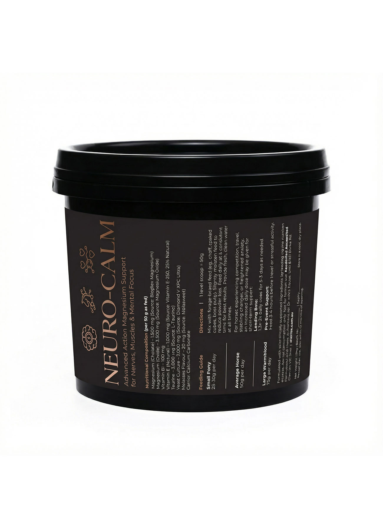 Neuro-Calm uses two magnesium sources to support normal neuromuscular function. Magnesium chelate provides a highly usable form, while magnesium oxide supports overall daily intake. Vitamin B1 supports normal nerve function and energy metabolism. Taurine is included as a supportive amino acid commonly used in calming and muscle support blends. Natural vitamin E provides antioxidant support for horses in work, and Diamond V XPC Ultra yeast culture supports digestive efficiency, which matters more than people think when horses are stressed, travelling, or off their routine.