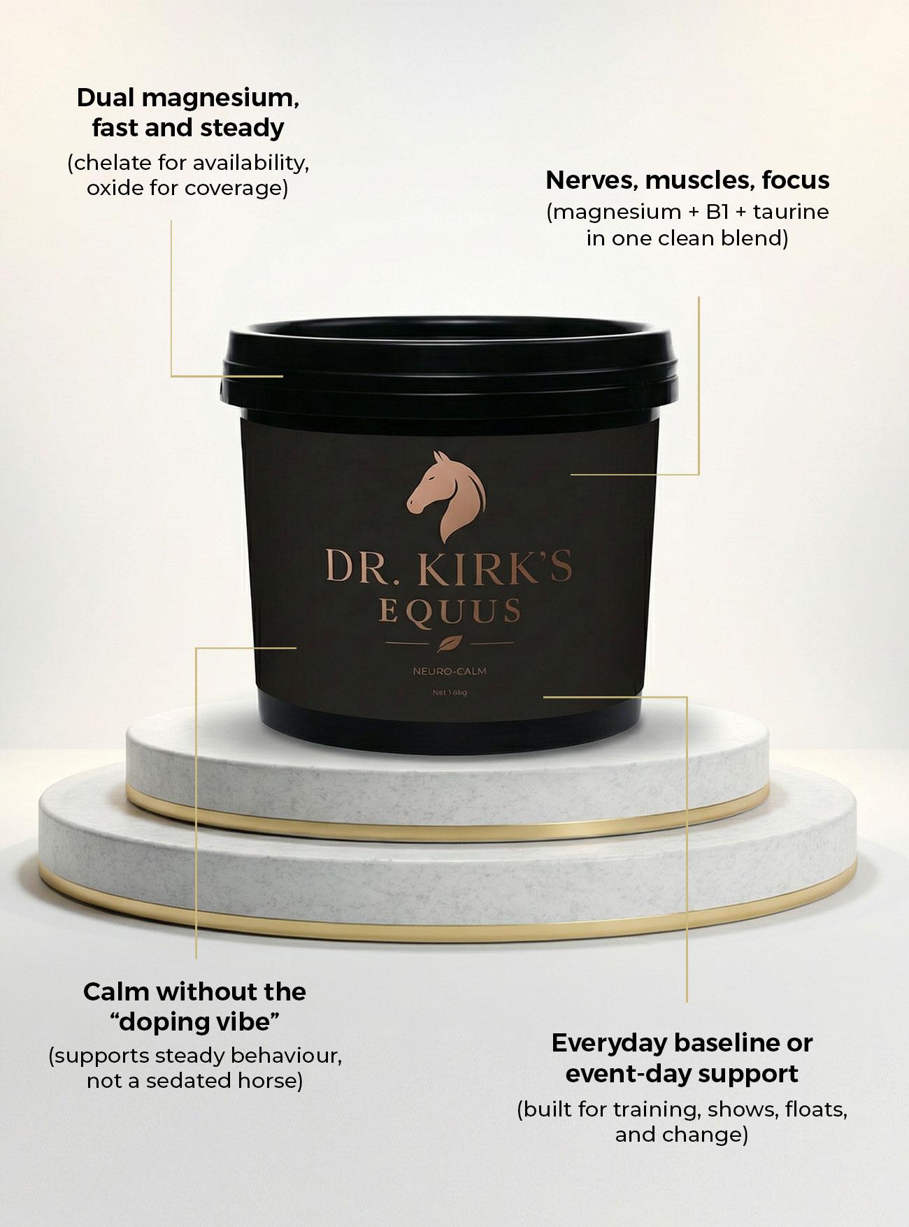 Neuro-Calm is a magnesium based daily support formula built for rideability, training consistency, and “keep it together” days. It supports normal nerve and muscle function without trying to be a magic potion.